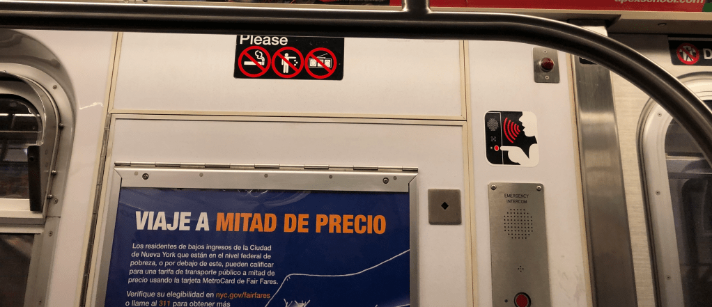 It comes as no shock that the MTA uses its own real estate to deliver relevant messages. The first two ads advertise Mayor Bill de Blasio’s Fair Fares initiative, a community measure that allows eligible applicants to receive a 50% discount on subway fares. The captured ads showcase how the same ad is displayed in different languages: the first ad is written in Chinese; the second in Spanish. The ads serve to inform its readers about the initiative and provide them a location in which to find out more: a website, a 311 number, and a Twitter hashtag, collectively.