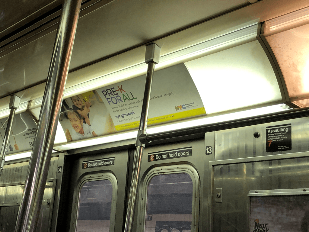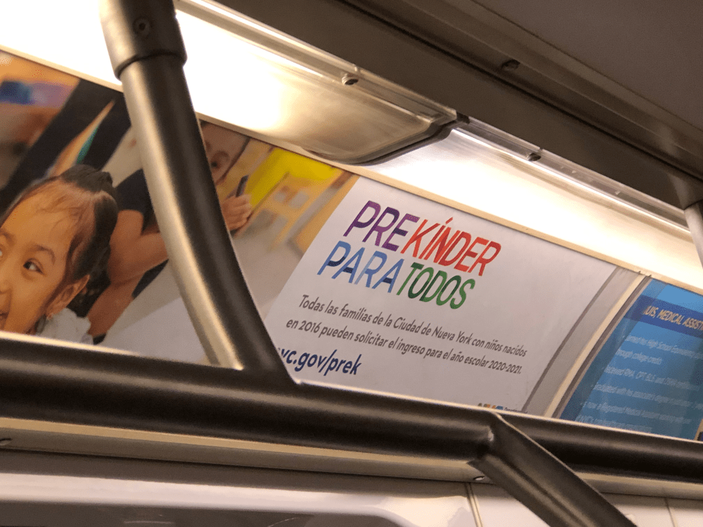 Pre-K for All ads are also shown in multiple languages. Their two photographed ads here (in English and Spanish) aim to provide pertinent information concisely and in multiple languages. The messages offer three directions in which readers can go: call 311, a text number, and a website. (Note: The subway bar is blocking this portion in the Spanish version of the ad.)