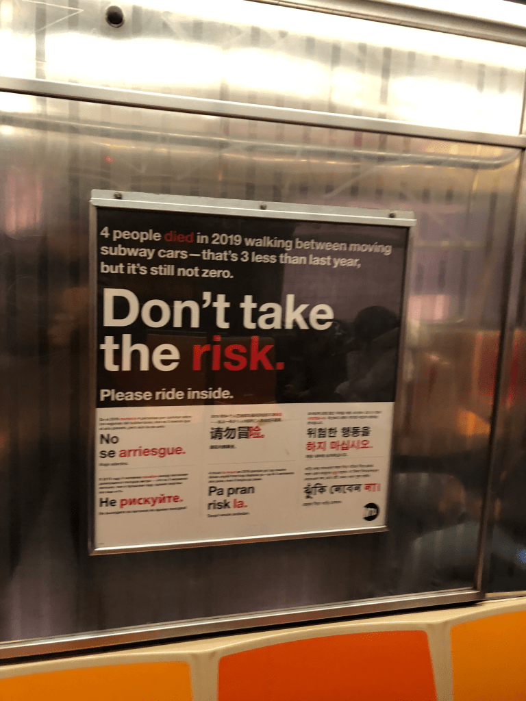 Finally, in one last MTA public directive, they encourage readers to “not take the risk” of walking between subway cars. Keeping in theme with other public messages, it is concise, direct, informative, and translated into 6 languages below the larger English message. There is no website, app, call line, or chat number. This ad directs you to stay exactly where you already are: inside.