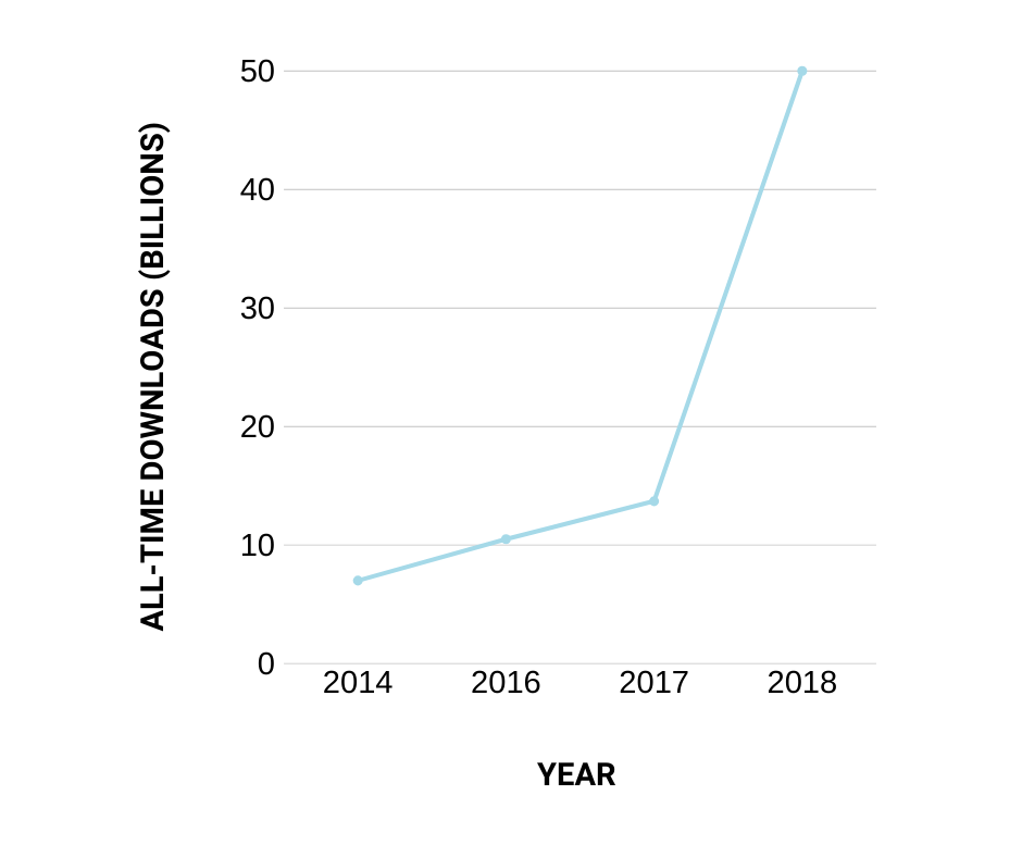 The number of podcast downloads has grown rapidly in the past six years. According to FastCompany, the number of podcast downloads on Apple and iTunes grew steadily from 2014 to 2017, where it saw a sharp increase in downloads, leaping from 13.7 billion to over 50 billion all-time downloads.